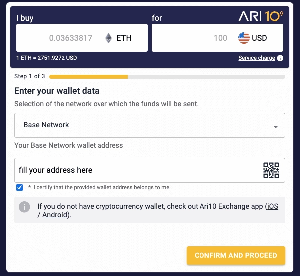 The second option is to purchase ETH directly on the Base network using our Ari10 Gateway widget. This solution saves you from having to perform additional blockchain transactions to fund your wallet.