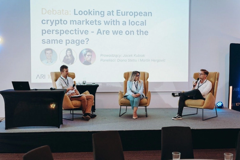 The next debate, titled *“Looking at the European Crypto Market with a Local Perspective – Are We on the Same Page?”* was moderated by Jacek Kubiak and conducted in English. Our representatives, Diana Stetiu (Romania) and Martin Hergovic (Slovakia), thoroughly discussed the development of crypto in their respective countries. Although both are somewhat behind Poland in crypto innovations, they still have significant untapped growth potential—opportunities Ari10 is set to capitalize on by establishing branches in both markets!