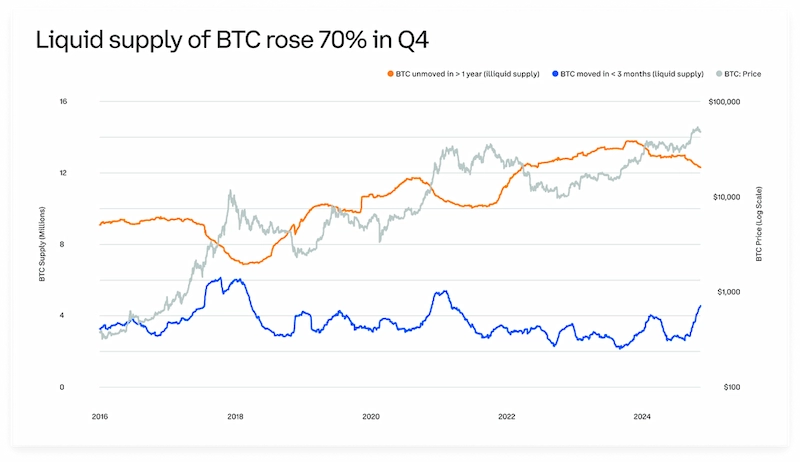 According to Glassnode, active supply—defined as coins that have moved within the past three months—increased by 70%, resulting in approximately 1.8 million BTC entering active circulation.