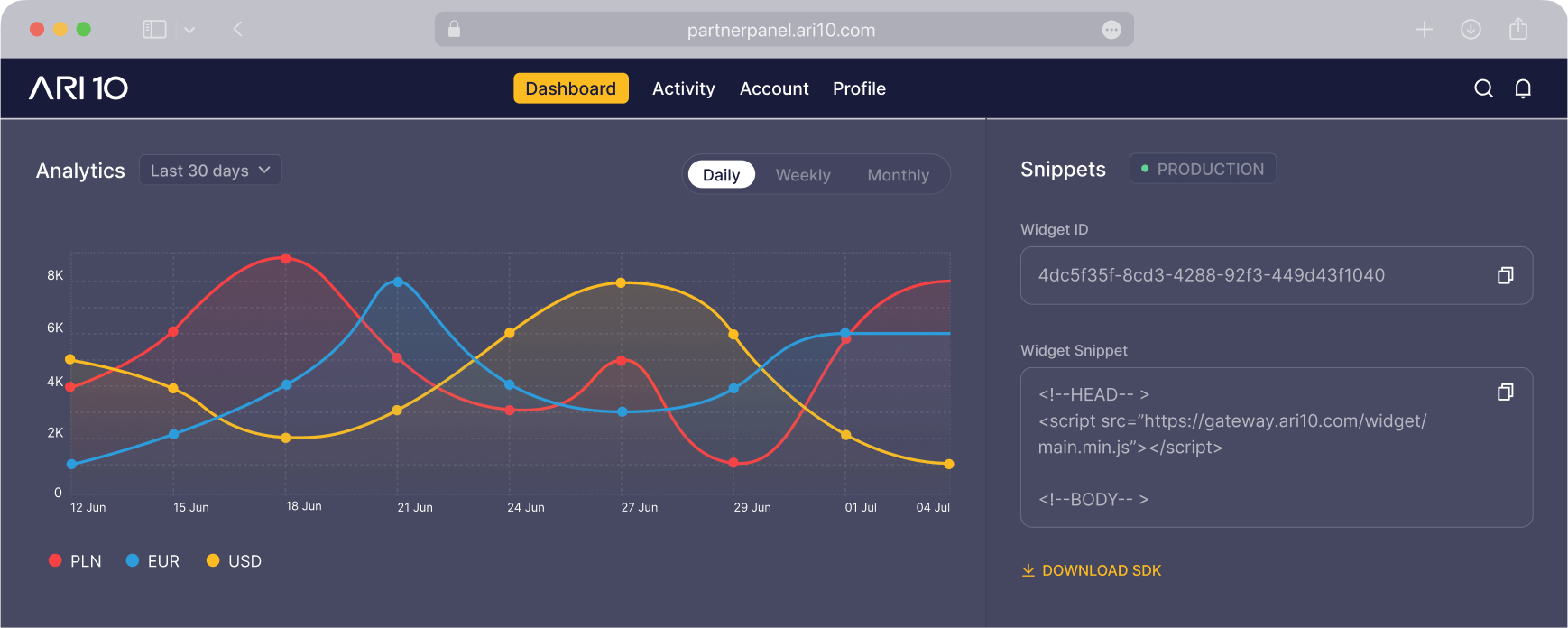 On-Ramp Gateway is very simple and fast to implement. It takes just a few lines of code to quickly embed the widget into your website or application.