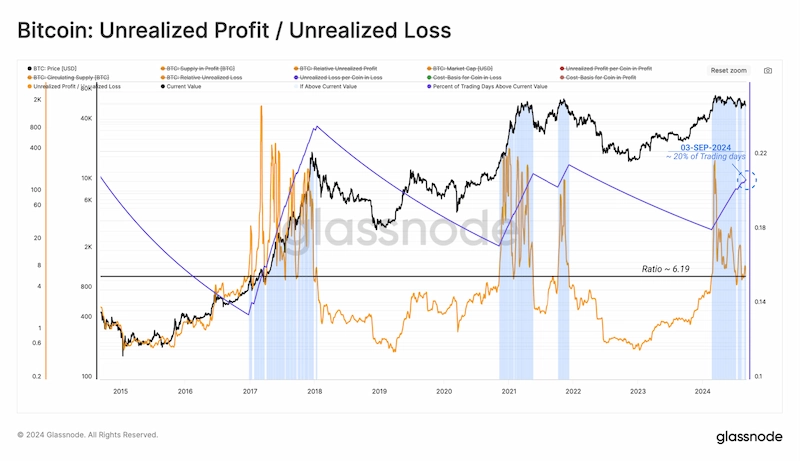 „Jeśli weźmiemy pod uwagę stosunek całkowitego niezrealizowanego zysku do niezrealizowanej straty, zobaczymy, że zyski pozostają 6 razy większe niż straty, co potwierdza powyższą obserwację. Około 20% dni handlowych odnotowało ten stosunek powyżej bieżącej wartości” – komentują analitycy Glassnode w swoim najnowszym przeglądzie wskaźników on-chain.