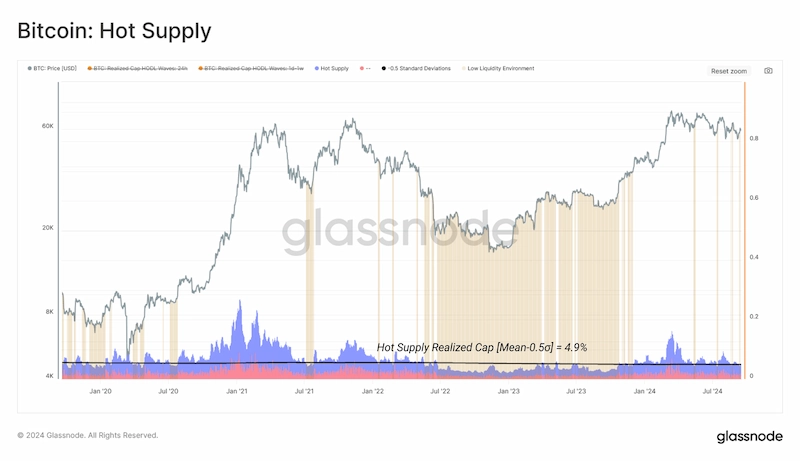 Podczas gdy rynek łapie bardzo długi oddech, właściciele BTC z całą pewnością nie mają zamiaru sprzedawać swoich monet. "Ggorąca podaż”, czyli BTC, które są zazwyczaj aktywne i gotowe do handlu – skurczyła się do zaledwie 4,7% całego ekosystemu bitcoina.