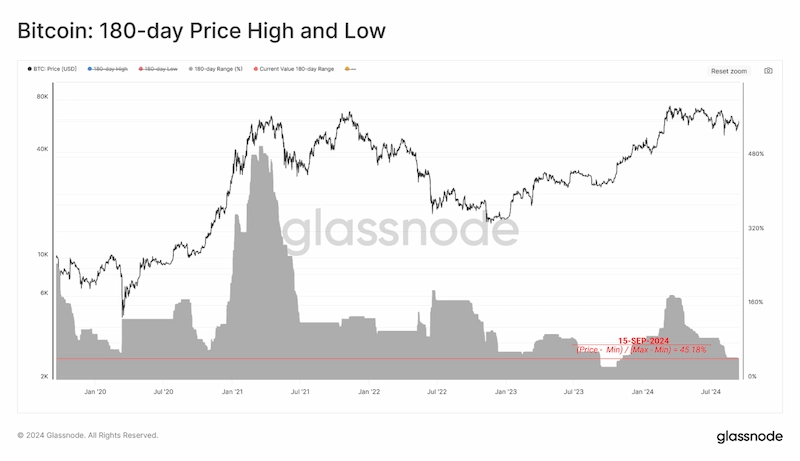 „Jedynie sierpień 2023 r. i maj 2016 r. wykazują ciaśniejszy 180-dniowy przedział cenowy. Podkreśla to względną ciasnotę obecnej struktury rynku” – komentuje Glassnode w swoim raporcie.