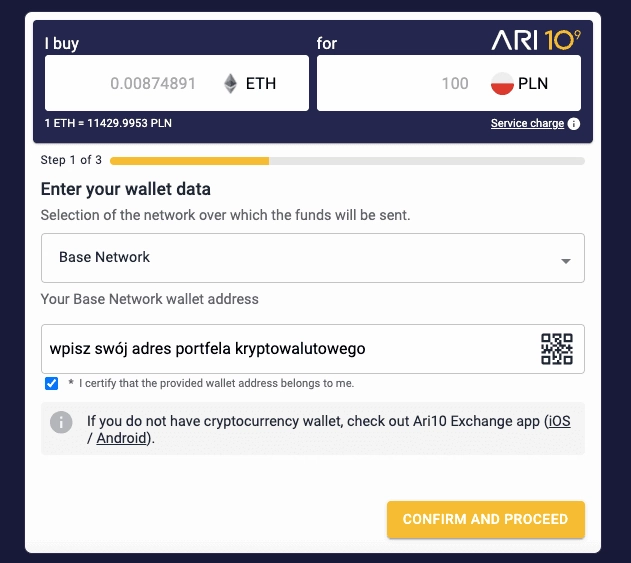 Druga opcja to zakup ETH bezpośrednio na sieć Base za pomocą naszego widgetu Ari10 Gateway. Dzięki temu rozwiązaniu nie musisz wykonywać dodatkowych transakcji na blockchainie, aby zasilić swój portfel.